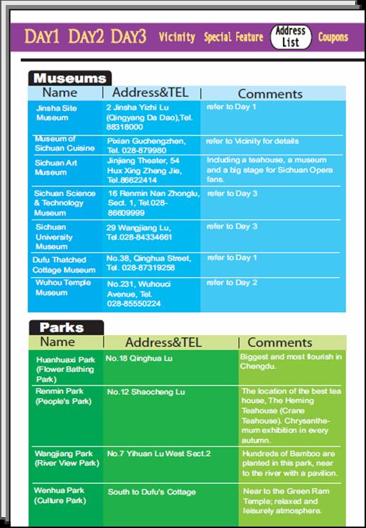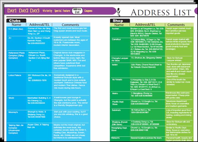 到哪里去吃饭,到哪里去买化妆品和礼物,选择在哪个公园休闲,选哪个博物馆参加最出名的展览,去哪个寺庙参拜,到哪家茶馆看茶道…所有这些问题,你都可以在地址一览表上找到答案.