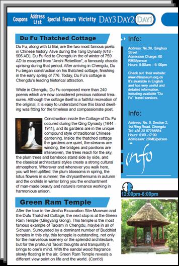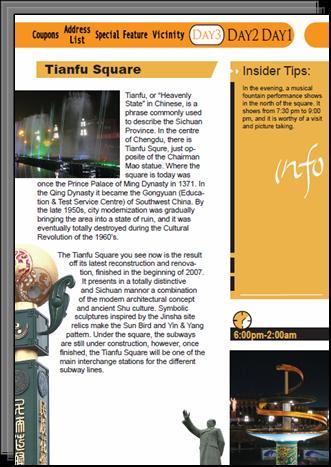本栏为游客突出显示本城的地方特色,如:特色食品,休闲娱乐,名山大川及各地的标志性建筑,还包括当地的风俗习惯和礼仪规范并为游客清晰呈现出各景点的详细地址.